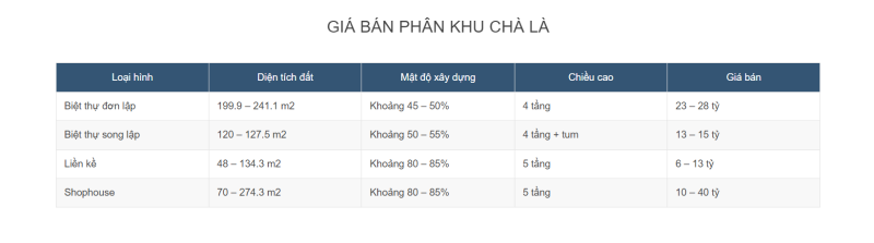 Biệt thự song lập Chà Là có 140 căn, diện tích đất từ 120 – 127.5 m2, mật độ xây dựng 50 – 55%, chiều cao 4 tầng + tum, nằm dọc theo các trục đường Chà Là, Chà Là 8, Chà Là 9, Chà Là 11, Chà Là 13. Biệt thự song lập Chà Là sở hữu lợi thế lớn khi nằm tiếp giáp công viên nội khu, chỉ với một vài bước chân để thụ hưởng tiện ích đẳng cấp. Biệt thự song lập Chà Là có số lượng khá lớn, nên khách hàng sẽ có nhiều sự lựa chọn. Hiện tại, giá bán biệt thự song lập Chà Là nằm trong khoảng từ 11 – 15 tỷ.